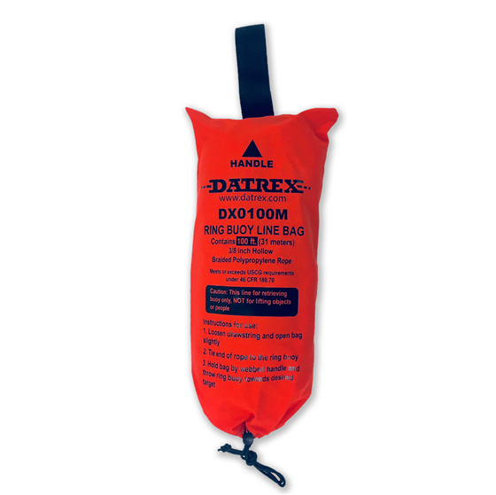 Presented in a high visibility orange bag with the rope perfectly coiled for immediate and continual use. The bag features a handle for control whenever in use and also doubles as a hanger on the lifering bracket. Constructed of marine grade components and contains 100 feet of 3/8” floating hollow braided polypropylene.