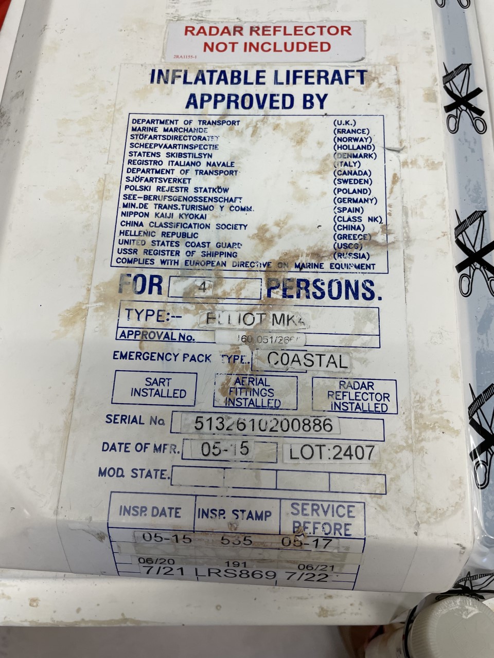 This Pre-Owned Elliot USCG Approved Coastal Liferaft comes with official Elliot certificate of re-inspection that's good for one calendar year.