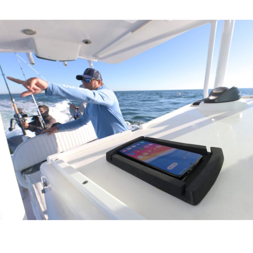 Catch is one of the most convenient ways to store and wirelessly charge your phone onboard indoors or out! Designed to install onto any flat surface, perfect for use on top of boat consoles.