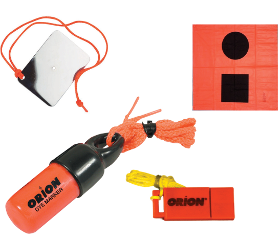 Selection of visual and audible signals that can be seen or heard by sea or air rescues. Packed in a polybag.