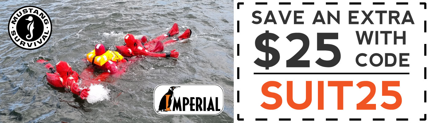 Take an additional $25 Off your new Immersion Suit. Be sure to enter coupon code SUIT25 at checkout. Only valid on in-stock Immersion Suits while supplies last.